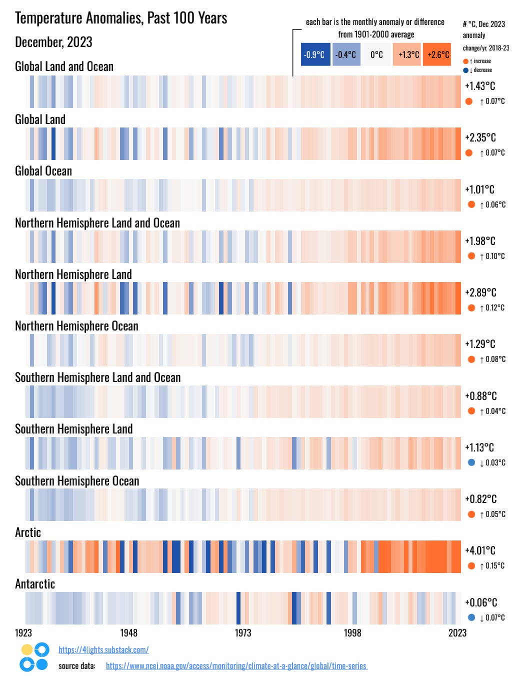 December, 2023 global temperatures were about +1.43°C relative to the base period; Dec. temperature anomalies were ↑ 0.07°C per year on average over the last 5 years.