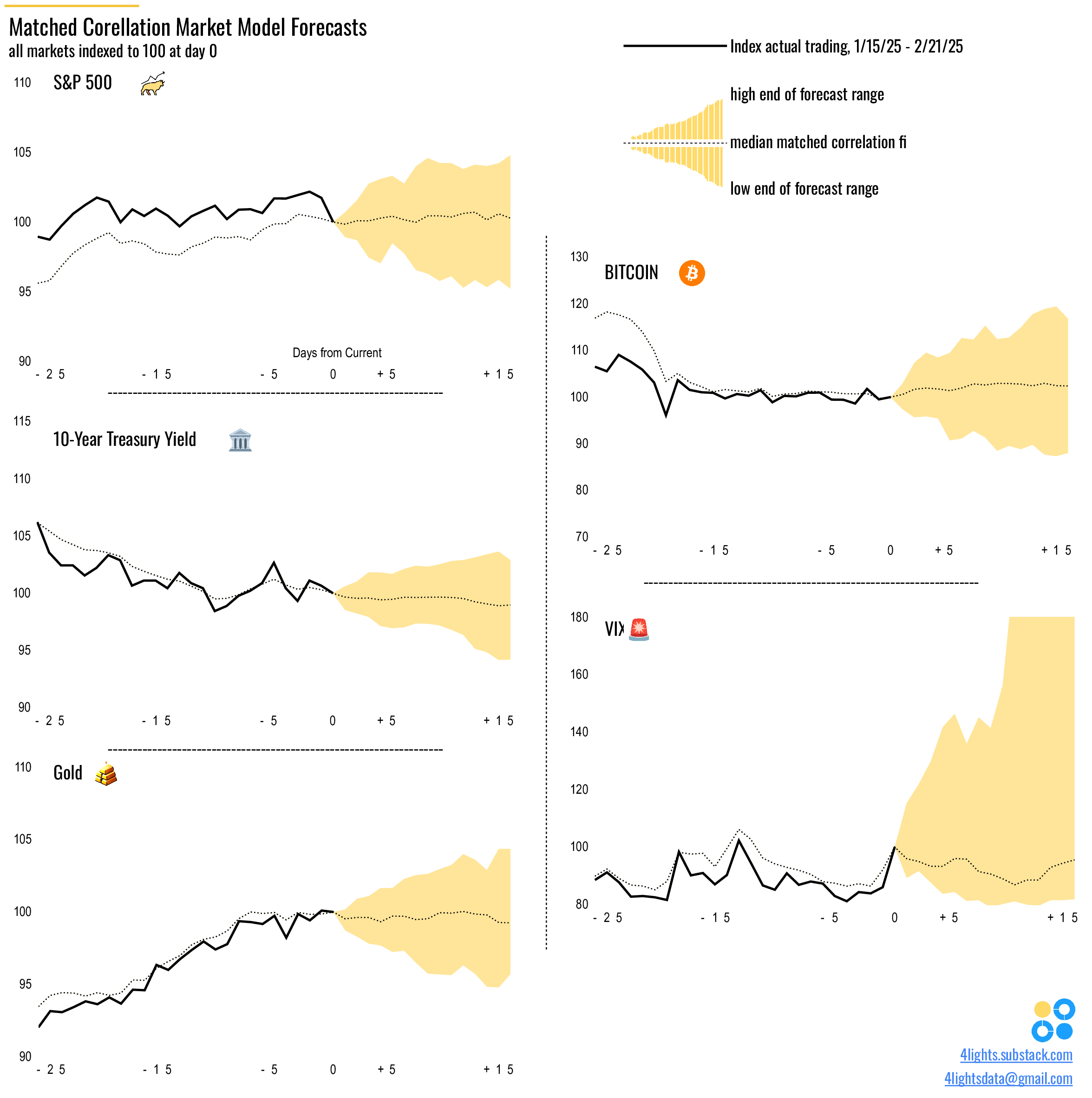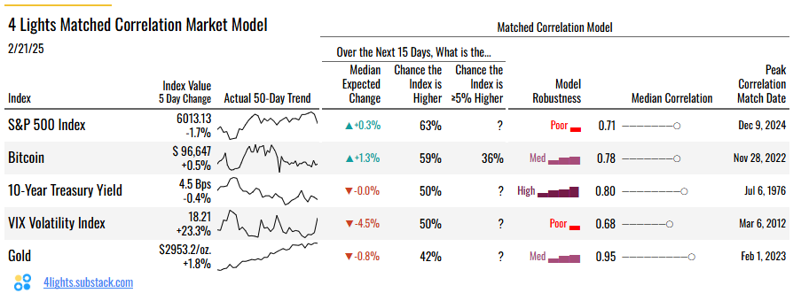 4Lights 15 Day Forecast: 🐂SP500 ▲+0.3% | 🅱️BTC ▲+1.3% | 🏛️10Yr Treasury Yld ▼-0.6% | 🚨VIX Volatility ▼-4.5% | ⚜️Gold ▼-0.8% (as of 2/21/25)