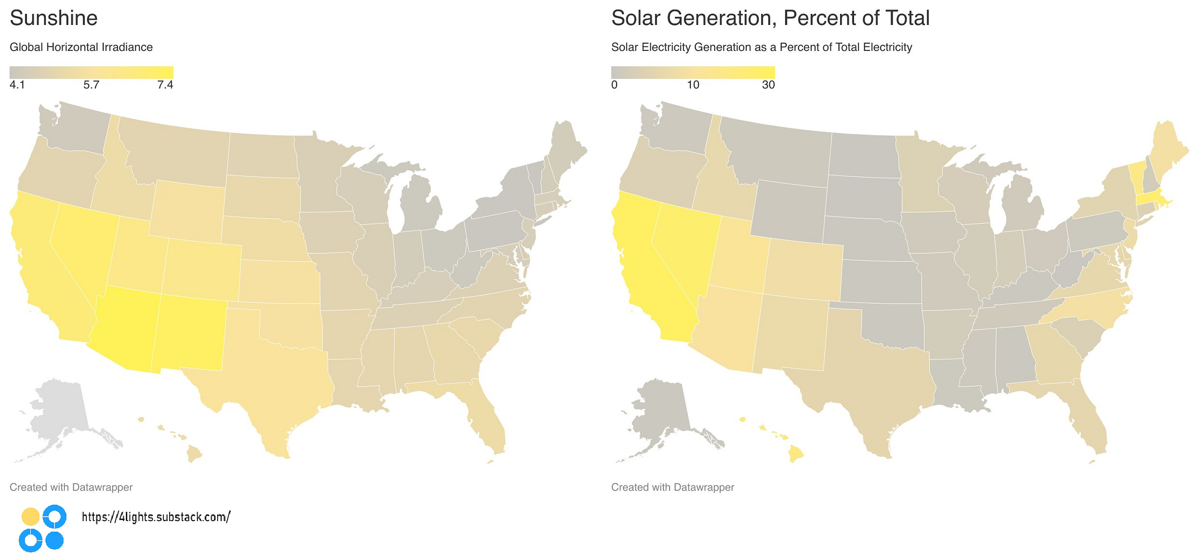 At the state level, the amount of sunshine available is not strongly correlated to the amount of solar generation