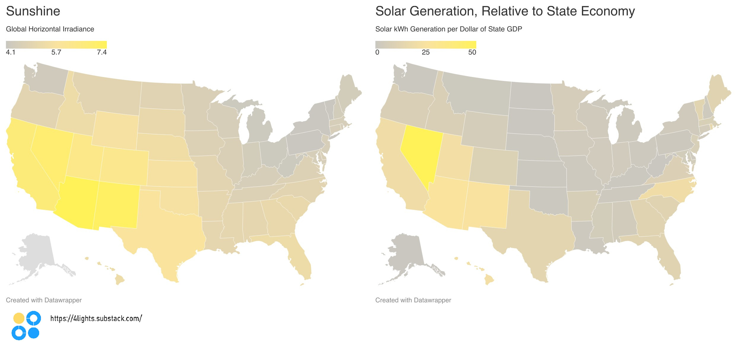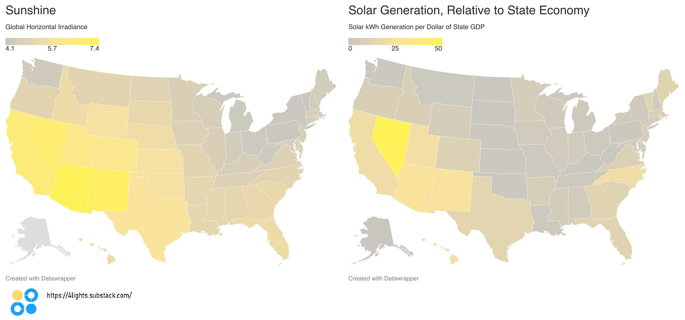 In this comparison, Nevada is the clear standout. But similar oddities emerge: North Carolina has almost double the amount of solar kWh/$ of GDP as Florida, despite North Carolina having about 10% less sunshine. The Northeast states don’t stand out as much because they have large economies, but it’s still surprising to see Maine and Vermont with more than 4X the amount of solar kWh/$GDP than Oklahoma.