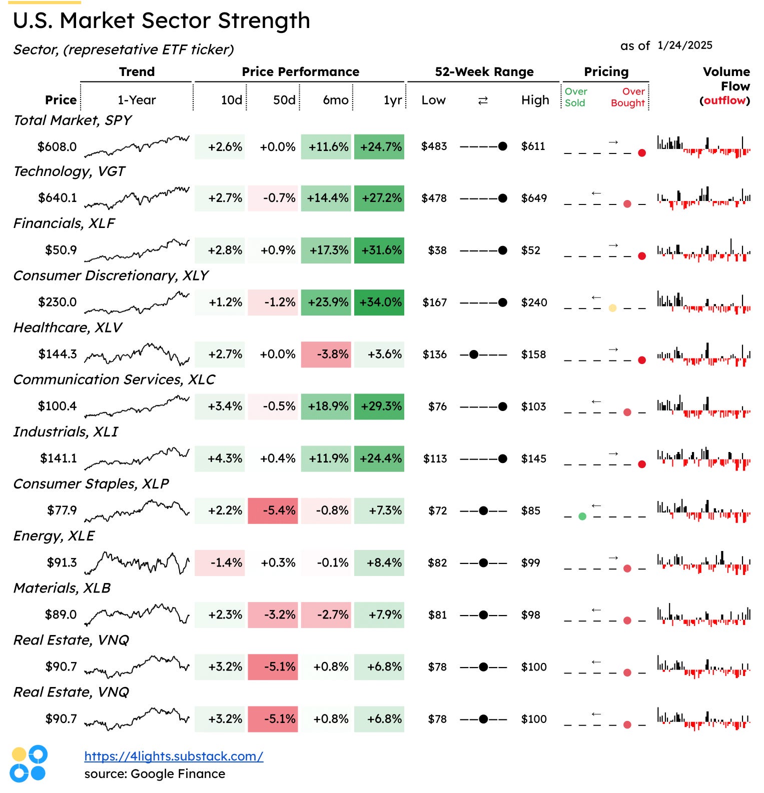 After a very weak December, markets (at leas the SP500 overall) have come back strong in January. I still get a sense there’s a lot of nervousness, though. For example, the famous “Buffet Indicator” is flashing red signals. This data shows which sectors (as represented by their largest respective ETFs) have over/under performed; which sectors might be over bought 🔴 or over sold 🟢; and how their volume is trending ⬛ or 🟥.