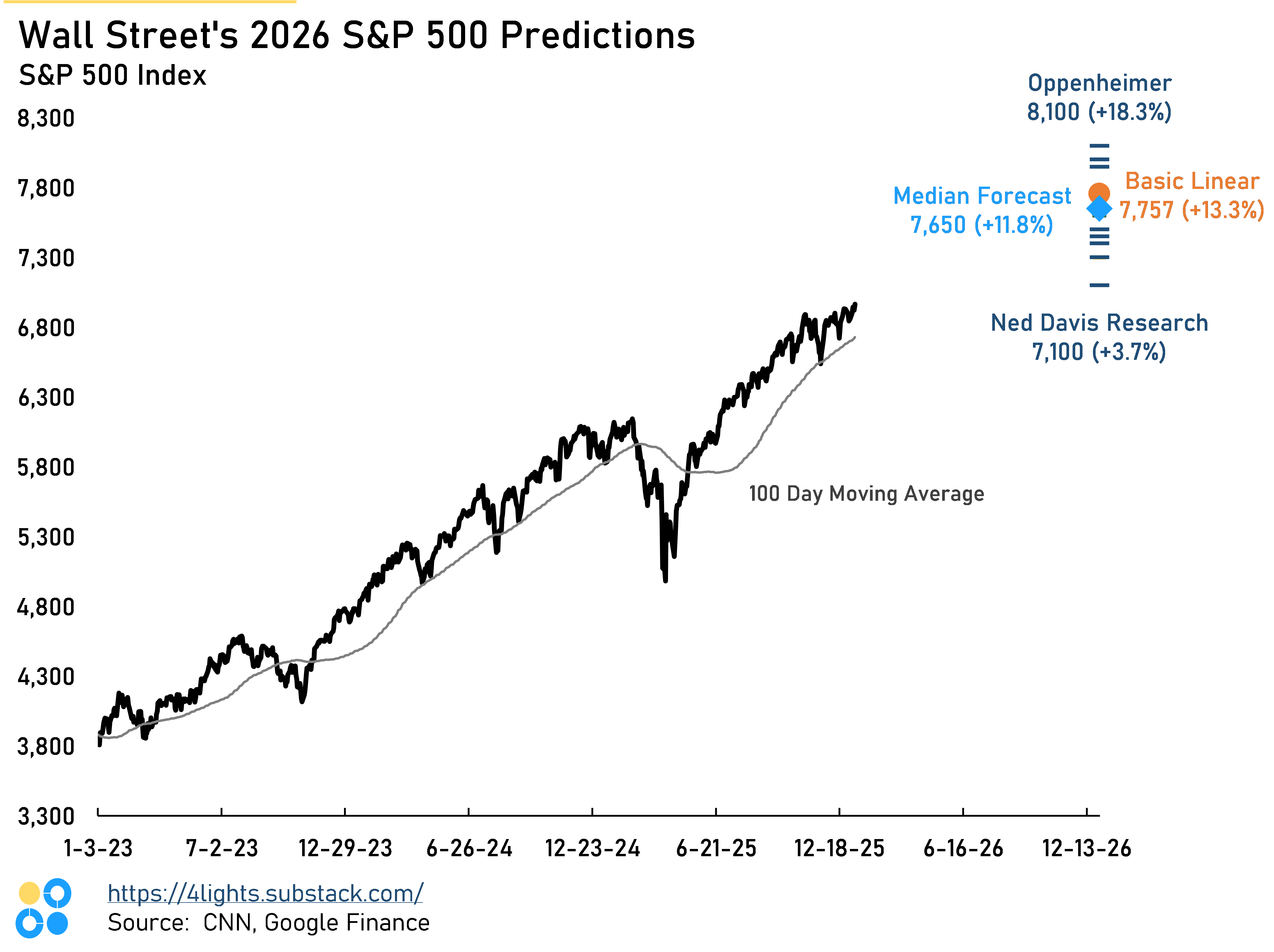 So where do Wall Street experts think the market is headed in 2026? The consensus is āhigherā, but not as high as recent years. Their median forecast is for the SP500 index to close 2026 at about 7,650 which would be an +11.8% gain. For comparison, a basic linear forecast based on the last 3 years of data expects the SP500 to hit 7,757 (+13.3% gain) by the end of 2026.1