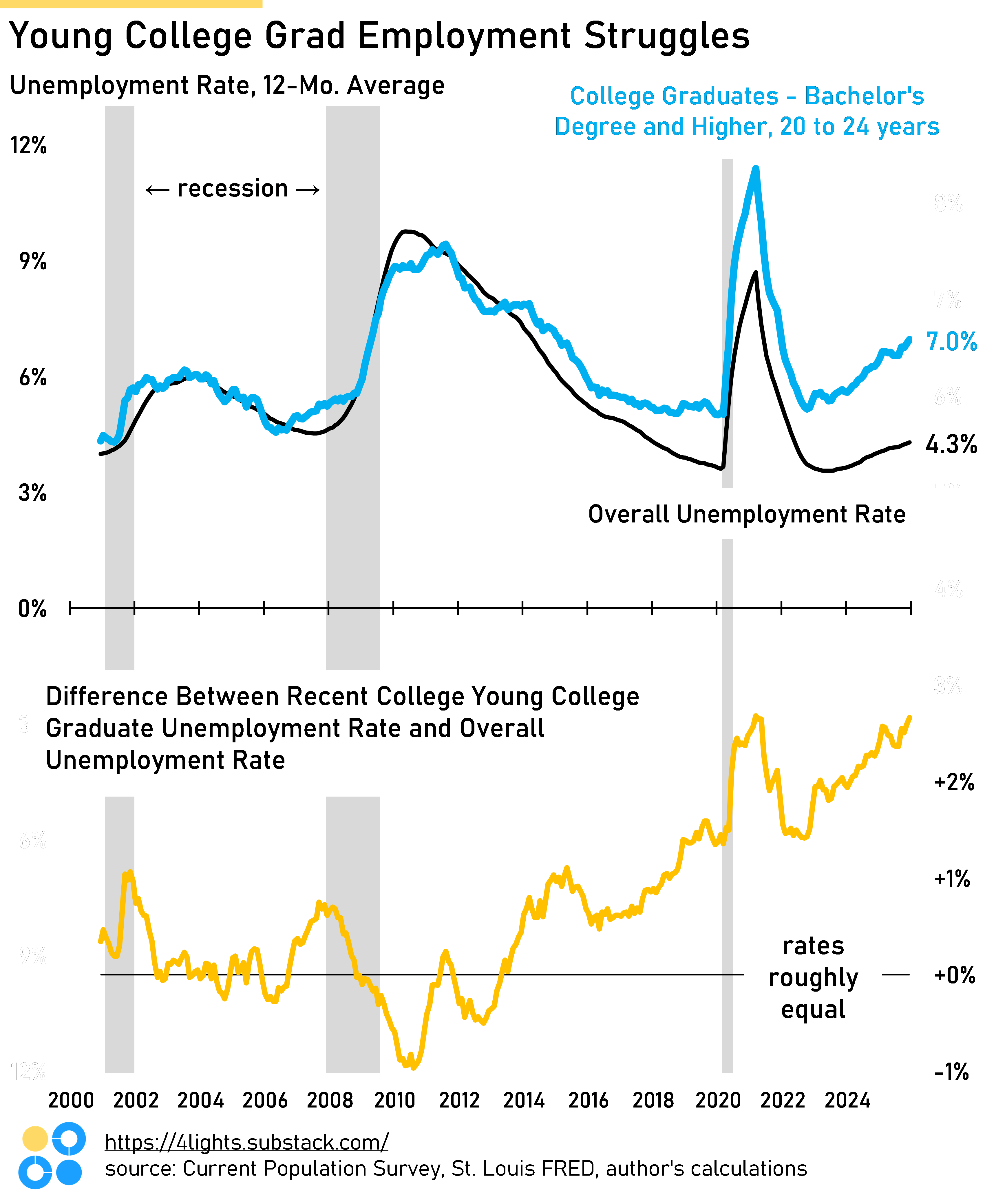 That said, I’m not here to resolve the broader “worth it” debate. What I do find interesting are the underlying labor market trends for young college graduates: